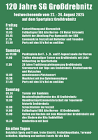 Die SG Großdrebnitz feiert am Wochenende vom 22. bis 24. August 2025 ihr 120-jähriges Bestehen. In diesem Zuge findet das 12. Beachvolleyballturnier auf dem Sportplatz der Spielgemeinschaft statt. Die Vorjahressieger müssen ihren Titel verteidigen.