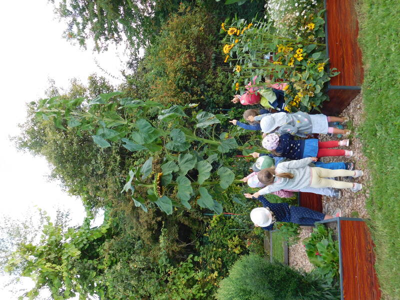 Seit dem Aufbau der neuen Fröbelbeete waren die Kinder sehr fleißig bei der Gartenarbeit. Alle sind ganz stolz darauf, dass ihre Arbeit in den Beeten Früchte trägt. Sogar eine große Sonnenblume von stolzen 4,28 Metern Höhe und einem Blütenkopfdurchmesser von 45 Zentimetern ist gewachsen. Die kleinen und großen „Butterberg-Wichtel“ bestaunen die Sonnenblume (Foto 2 / Fotos: Kinderhaus „Butterberg-Wichtel“ jeden Tag.