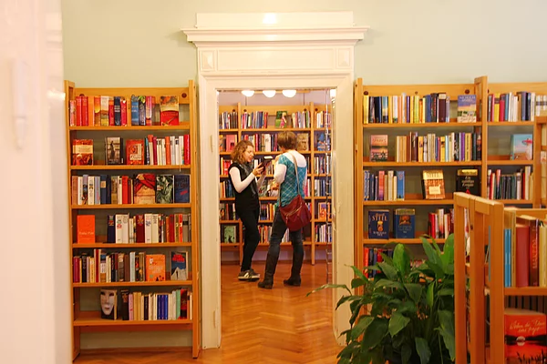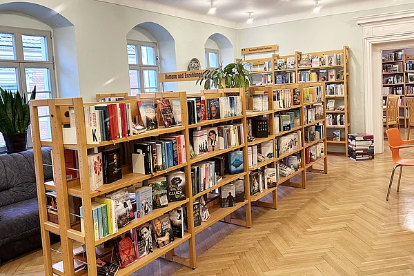 Die Bibliothek ist erreichbar über den Eingang von der Dresdener Straße oder durch den schönen Innenhof auf der Rückseite des Hauses. Auf einer Fläche von ca. 500 m² stehen den Besuchern ca. 26.000 Medien zur Verfügung.