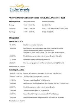 Alljährlich um den Nikolaustag findet in Bischofswerda das traditionelle Weihnachtsmarkt-Wochenende auf dem Altmarkt statt. Nicht nur der Weihnachtsmann und seine Engel sorgen für Unterhaltung, sondern auch musikalische Programmpunkte auf der kleinen Bühne. Auch kulinarisch bleiben keine Wünsche offen. Gut 25 Händler verwöhnen die Gaumen der kleinen und großen Besucher. So viel Weihnacht für die Sinne in derart entspannter Atmosphäre ist genau die richtige Vorbereitung für die nahenden Festtage. Klein, aber fein – das ist Weihnachten in Bischofswerda.