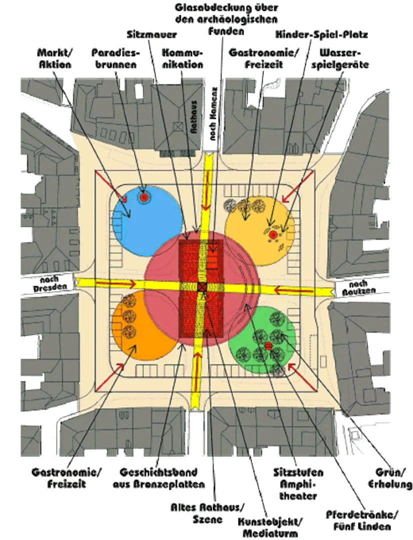 Die bauliche Gliederung des Marktplatzes folgt streng und sparsam den funktionellen Anforderungen, die sich aus der Aufgabenstellung für die Nutzung des Platzes ergeben. Der zentrale Platz wird in seiner Gesamtheit zur Szenenfläche, zur Bühne, zum Kunstobjekt, das multifunktional nutzbar ist und sich ständig anders präsentiert, ein Ort der Beständigkeit und Veränderung, ein Ort der Ruhe und Bewegung, ein Ort mit hohem Erlebniswert, ein Ort der verbindet, unterhält, animiert und einlädt. Die Marktfassaden werden zur Kulisse für diese Bühne, für diese Schauspiel. Dabei werden bewusst historische Elemente (altes Rathaus, Pferdetränken, Paradiesbrunnen, Schiebock) in die Marktgestaltung einbezogen.
