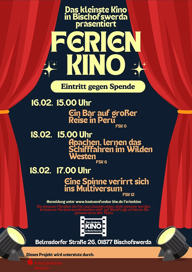 Auch in den Winterferien 2026 heißt es wieder: Vorhang auf im kleinsten Kino Bischofswerdas. Der Bischofswerdaer Kostümfundus e.V. setzt sein Ferienkino-Format fort und lädt Familien, Kinder und Jugendliche zu drei Filmvorführungen in die Vereinsräume in der Belmsdorfer Straße 26 ein.