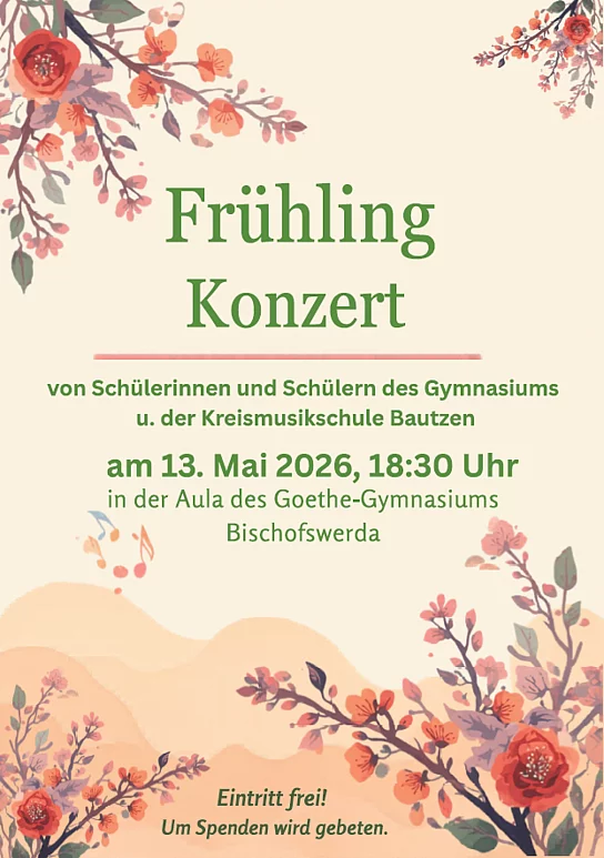 Seit vielen Jahren gibt es in Zusammenarbeit vom Goethe-Gymnasium Bischofswerda und der Kreismusikschule Bautzen ein Frühlingskonzert, das auch in diesem Jahr in der Aula unseres Gymnasiums stattfinden wird.