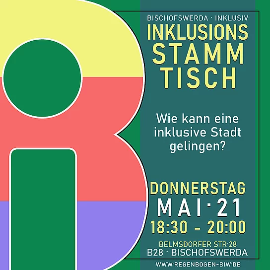 Wie kann eine inklusive Stadt gelingen? Und wie können wir die Inklusion vor Ort stärken? Dieser gesellschaftlich sehr relevanten Frage- und Aufgabenstellung geht der Inklusions-Stammtisch nach, bei dem Betroffene, soziale Akteure und Interessierte sich einmal im Monat zu einem Vernetzungstreffen im B28 des Regenbogen e.V. zusammenfinden, um an in erster Linie für Bischofswerda sinnvollen Lösungen zu arbeiten. Jeder ist willkommen!