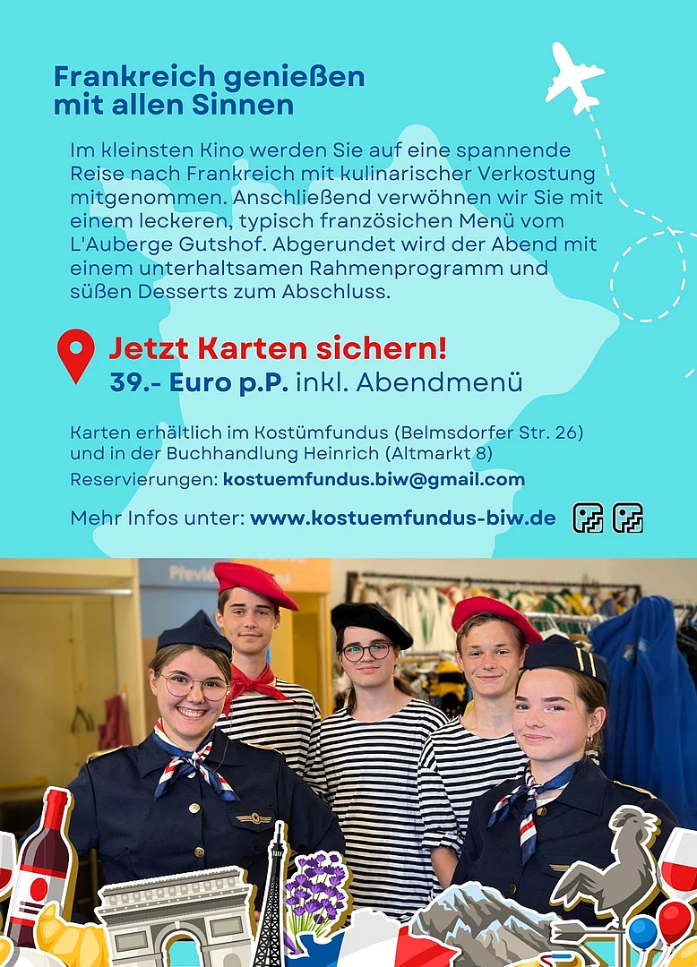 Der Auftakt beginnt um 18:30 Uhr im „Kleinsten Kino in Bischofswerda“ auf der Belmsdorfer Straße 26 mit einem interaktiven kulinarischen Reisevortrag. Ein gebürtiger Franzose nimmt die Besucher mit auf eine Reise durch sein Heimatland, teilt persönliche Einblicke und steht den ganzen Abend für Gespräche zur Verfügung.