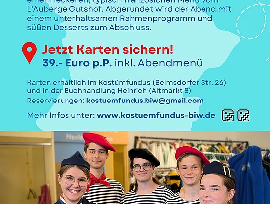 Im Anschluss geht es in einen nahegelegenen Feierraum, wo das „L’Auberge Gutshof“ aus Belmsdorf ein französisch inspiriertes Zwei-Gänge-Menü serviert. Als süßer Abschluss warten im Mitmach-Markt originale Crêpes oder Zuckerwatte. Begleitet wird der Abend von einem unterhaltsamen, typisch französischen Rahmenprogramm.